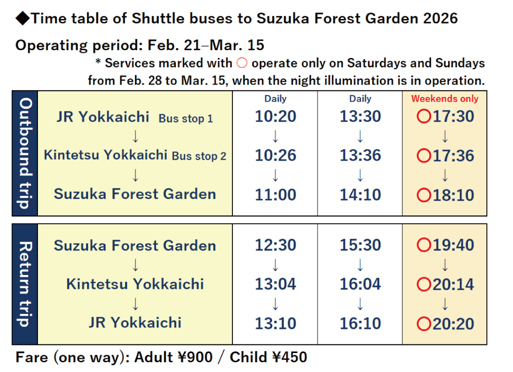 During certain dates within the garden’s opening period, temporary shuttle buses are operated by Mie Kotsu Co., Ltd. (departing from JR Yokkaichi Station via Kintetsu Yokkaichi Station).