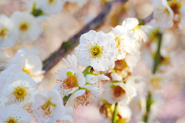 緑色の萼(がく)と新梢、白い八重咲きの花が特徴のしだれ梅。蕾の時期や咲き始めは爽やかな薄緑色に見え、上品で美しい。園内ではやや遅咲き。