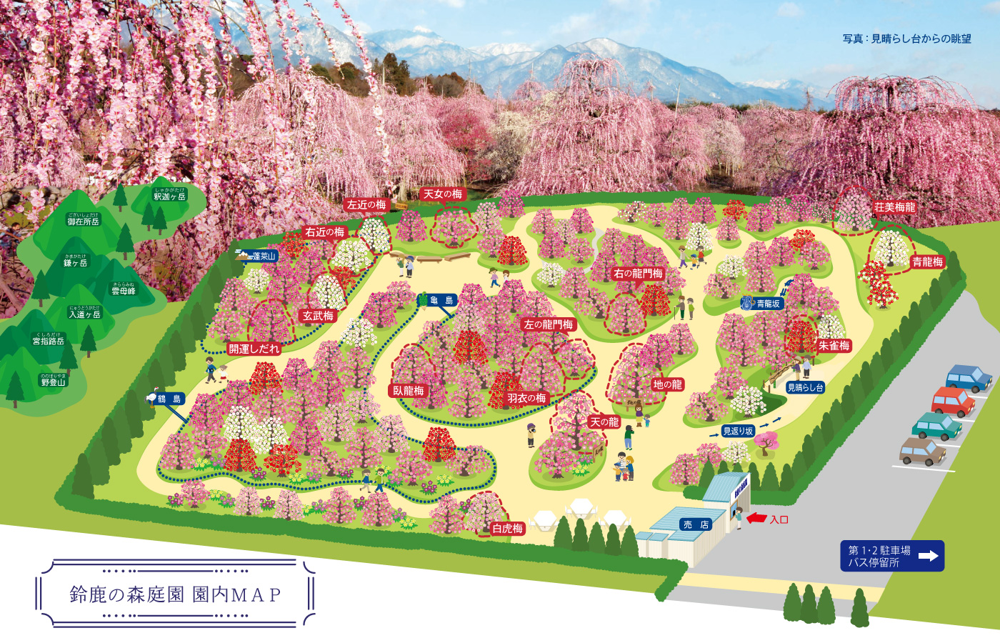 鈴鹿の森庭園で最も多いのが呉服しだれですが、他にも梅を中心に多くの花々が園内を彩っています。どのような梅や花をお楽しみいただけるかご紹介いたします