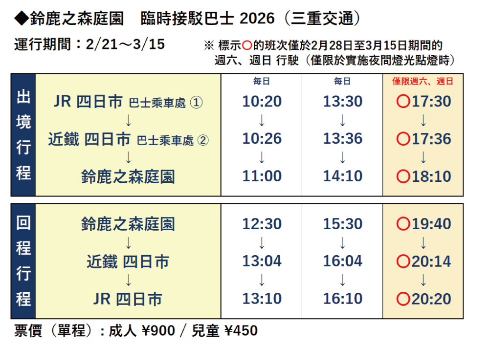 2026年的接駁巴士將於2月21日(星期六)至3月15日(星期日)期間運行。