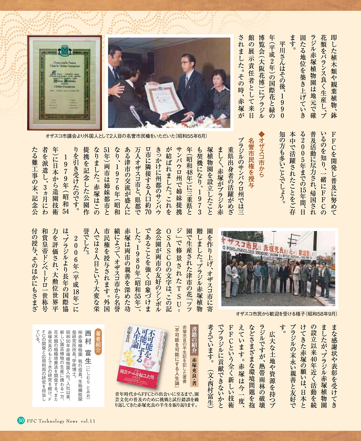 2006年(平成18年)には、ブラジルより長年の国際協力を評価され、大勲位世界平和賞皇帝ドンペードロ一世称号付の授与、そのほかにもさまざまな感謝状や表彰を受けてきましたが、ブラジル赤塚植物園の設立以来40年近く活動を続けてきた赤塚の願いは、日本とブラジルの末永い親善と友好です。