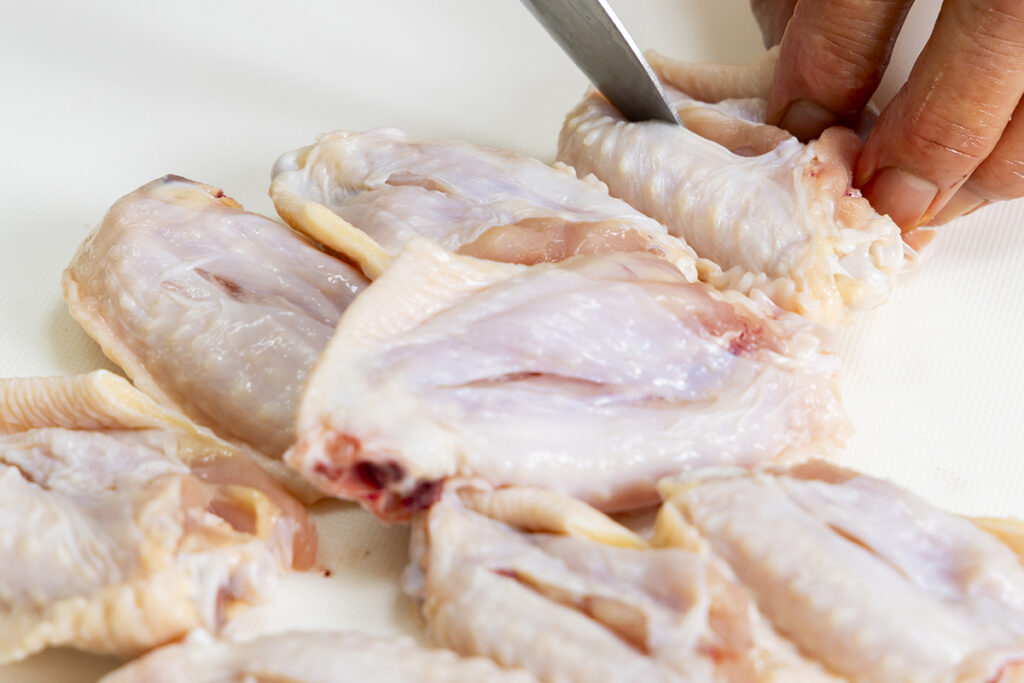 手羽先の骨を中心に包丁を入れて切れ目をつけておく。
