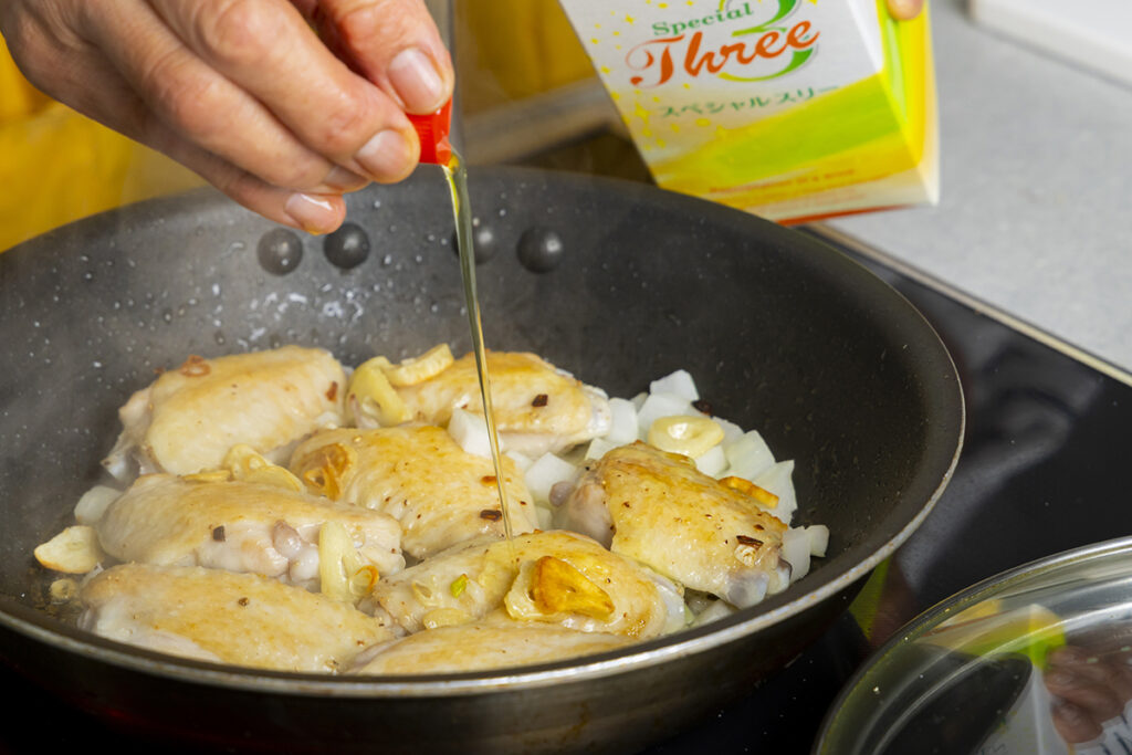- フライパンに油を熱し、ニンニクを焼いて香りを出してから、手羽先を入れて両面焼きます。タマネギを加え、油を絡ませてから酒とパイロゲンをふって蒸し焼きにします。