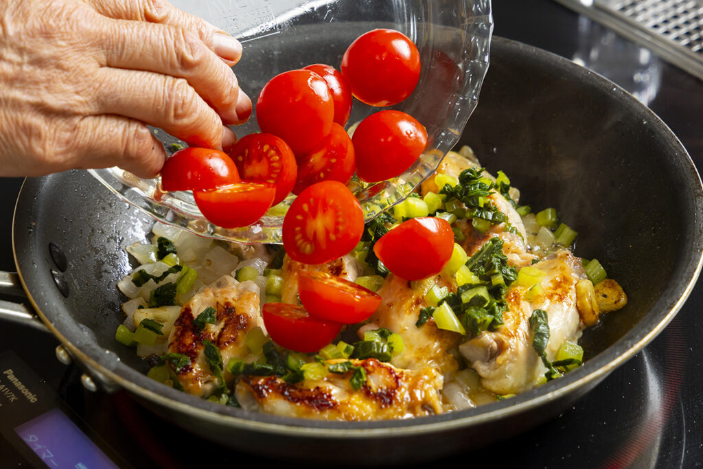 蒸し焼きで十分に手羽先に火が通ったら、野沢菜とトマトを加えて炒める。