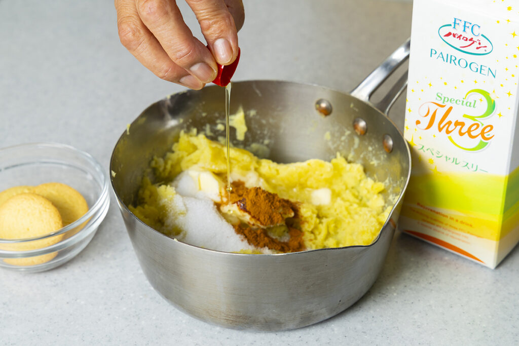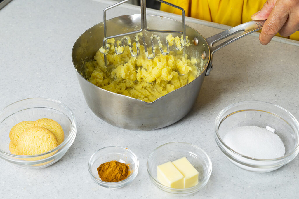 - サツマイモがあたたかいうちにきめ細かく潰し、砂糖、バター、シナモン、パイロゲンを入れて混ぜます。
