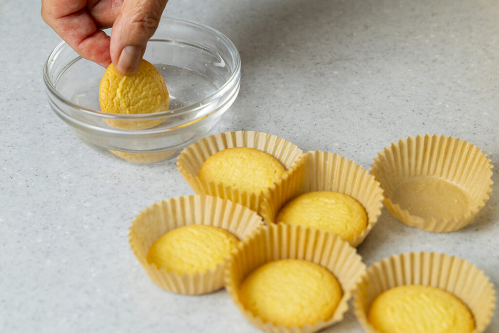 クッキーは水をくぐらせてから、ケーキカップの底に入れる。