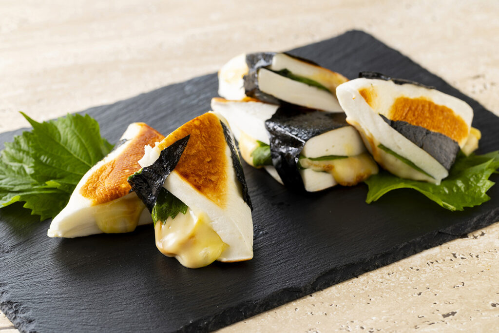 今回ご紹介するひとつ目のレシピは、「はんぺんのチーズ海苔巻き」です。白身魚をすり潰したすり身に、山芋などを加えた練りものである「はんぺん」は、低カロリーなのにタンパク質が豊富。ビタミンやカルシウムも含まれていて、ダイエット向きの食材とも言われます。そのはんぺんに、チーズと味噌という和洋の発酵食品を使い、海苔で巻きました。お手軽にできて、なおかつヘルシーなおつまみです。