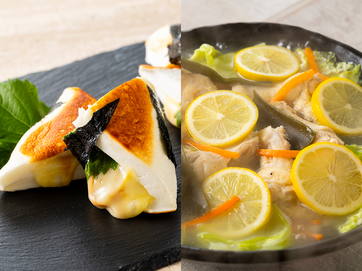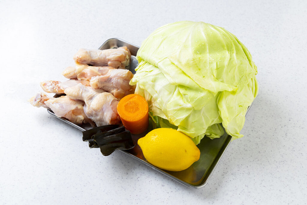 ふたつ目は、「鶏の塩レモン鍋」。鍋料理では、肉や魚介類、そして野菜やキノコをバランスよくたくさん食べられます。また、家族や友人とのお酒の席でも重宝するメニューです。このレシピは、鶏の手羽元を、たっぷりのキャベツやニンジンといっしょにさっぱりレモン味で楽しもうというというものです。いつもの水炊きとはひと味違う鍋料理に仕上がりました。