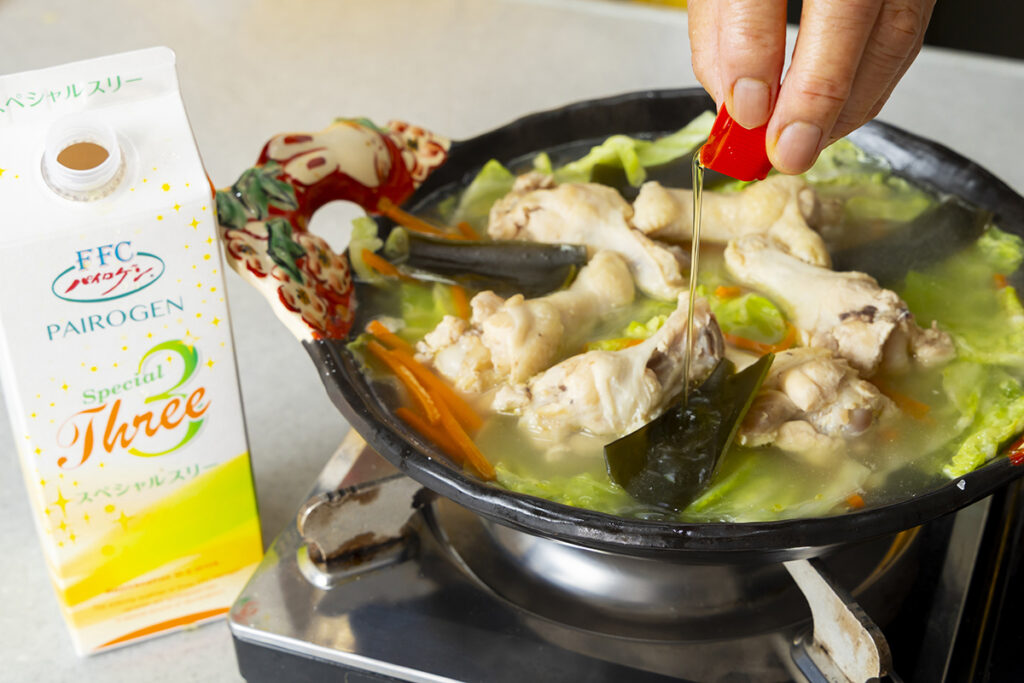 手羽元が煮えたら野菜を入れて、調味料とパイロゲンを。
