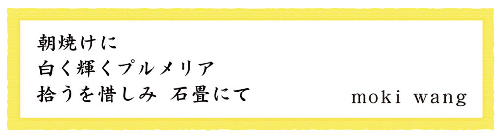 朝焼けに白く輝いているプルメリア。石畳にあるのも風情があるので、拾ってしまうのがもったいない思いでいる。