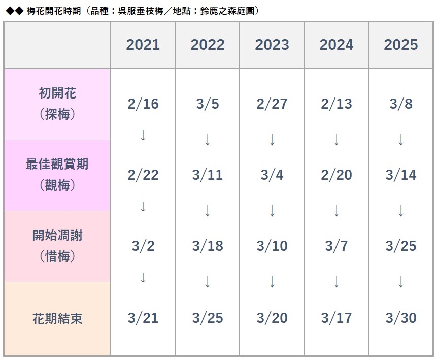 吳服垂枝梅的開花時間會因天候等因素而有所前後變動。規劃來園行程時,請將過去的開花狀況作為參考。